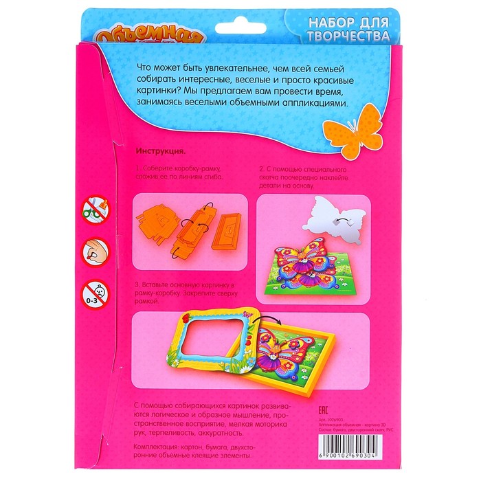 Самым маленьким особенно понравится, что элементы не нужно вырезать, они легко выдавливаются из листов-основ. Двухсторонний скотч придаст картине необходимую глубину - каждый элемент находится в своей плоскости. Объемная рамка, входящая в набор, придаст картине законченный вид - просто соберите ее и приклейте.