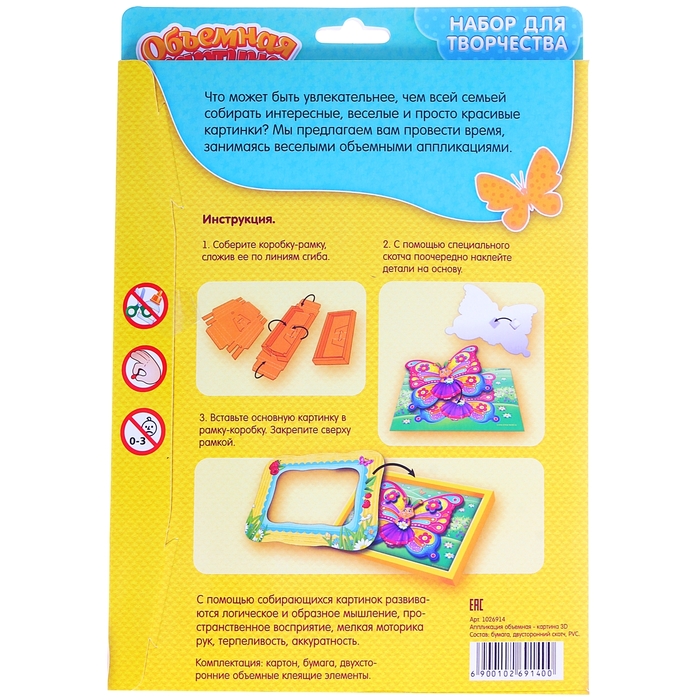 Самым маленьким особенно понравится, что элементы не нужно вырезать, они легко выдавливаются из листов-основ. Двухсторонний скотч придаст картине необходимую глубину - каждый элемент находится в своей плоскости. Объемная рамка, входящая в набор, придаст картине законченный вид - просто соберите ее и приклейте.