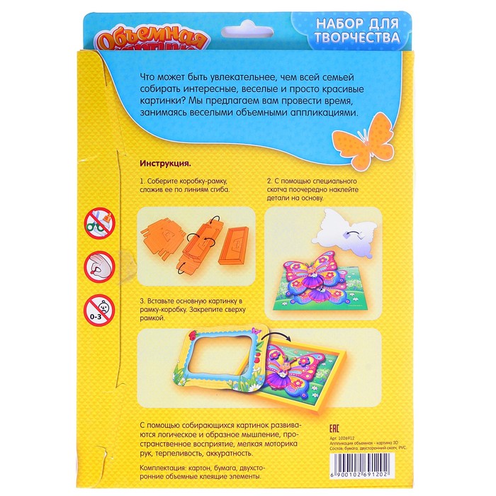 Самым маленьким особенно понравится, что элементы не нужно вырезать, они легко выдавливаются из листов-основ. Двухсторонний скотч придаст картине необходимую глубину - каждый элемент находится в своей плоскости. Объемная рамка, входящая в набор, придаст картине законченный вид - просто соберите ее и приклейте.