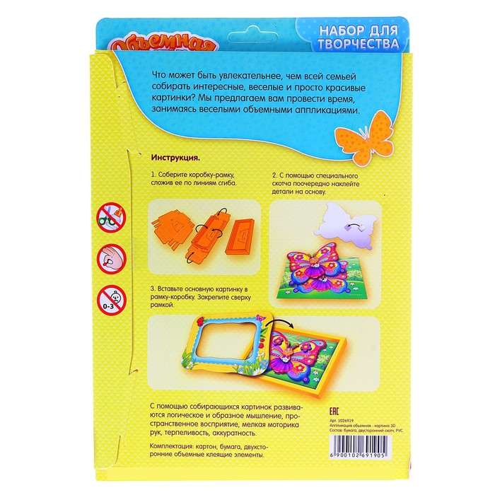 Самым маленьким особенно понравится, что элементы не нужно вырезать, они легко выдавливаются из листов-основ. Двухсторонний скотч придаст картине необходимую глубину - каждый элемент находится в своей плоскости. Объемная рамка, входящая в набор, придаст картине законченный вид - просто соберите ее и приклейте.