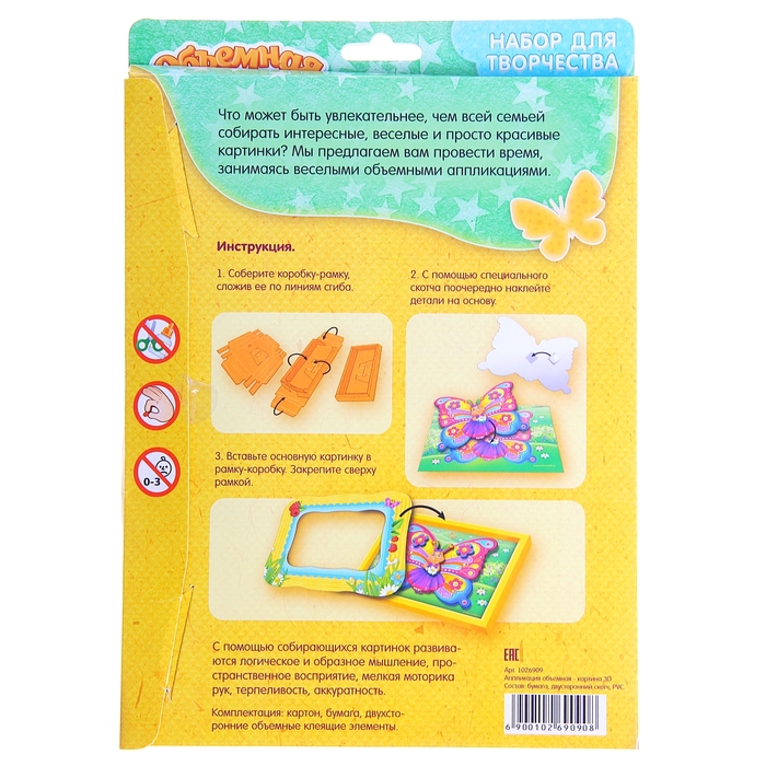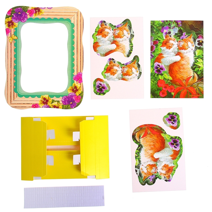 Самым маленьким особенно понравится, что элементы не нужно вырезать, они легко выдавливаются из листов-основ. Двухсторонний скотч придаст картине необходимую глубину - каждый элемент находится в своей плоскости. Объемная рамка, входящая в набор, придаст картине законченный вид - просто соберите ее и приклейте.