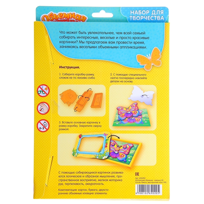 Самым маленьким особенно понравится, что элементы не нужно вырезать, они легко выдавливаются из листов-основ. Двухсторонний скотч придаст картине необходимую глубину - каждый элемент находится в своей плоскости. Объемная рамка, входящая в набор, придаст картине законченный вид - просто соберите ее и приклейте.