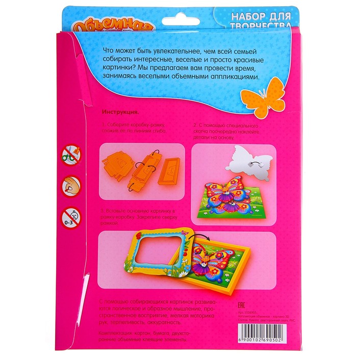 Самым маленьким особенно понравится, что элементы не нужно вырезать, они легко выдавливаются из листов-основ. Двухсторонний скотч придаст картине необходимую глубину - каждый элемент находится в своей плоскости. Объемная рамка, входящая в набор, придаст картине законченный вид - просто соберите ее и приклейте.
