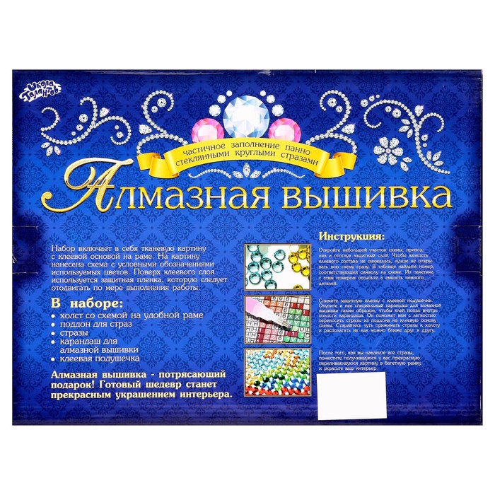 Часть картины предстоит заполнить стразами, другая часть напечатана на холсте-основе — такое изделие легче и быстрее создать. Поэтому набор подойдёт для тех, кто впервые пробует свои силы в этой технике или любит быстро добиваться результата.