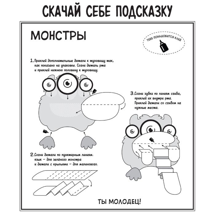 Для этого необходимо собрать монстра, придумать ему имя, можно прикрепить его на палочку и начать с ним играть!