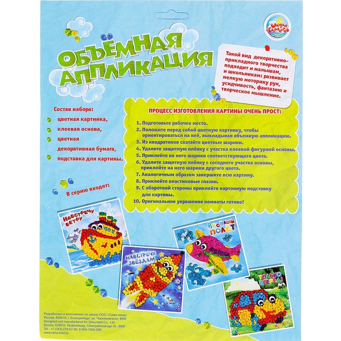 На аппликации есть специальный клеевой слой под защитной пленкой, разделенный на модули. Каждый модуль определенного цвета, чтобы ребенку было проще сориентироваться, какого цвета шарики к нему приложить. Все, что вам нужно - это снять пленку с выбранной части аппликации и приклеить к ней скатанные шарики одного цвета.