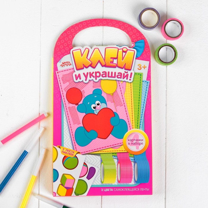 При создании данной аппликации вы будете использовать несколько интересных техник. Для начала необходимо украсить большие плоскости картинки клейкой лентой с разными узорами. Заполнять узорными полосками можно в любом порядке — это придаст дополнительную яркость. Чтобы украсить картинку и добавить в неё интересные элементы, в наборе предусмотрены 2 листа с наклейками. На обороте упаковки вы найдёте примеры готовых картинок, но мы советуем довериться своей фантазии и создать собственные сюжеты. Такой необычный вид творчества порадует каждого ребёнка!