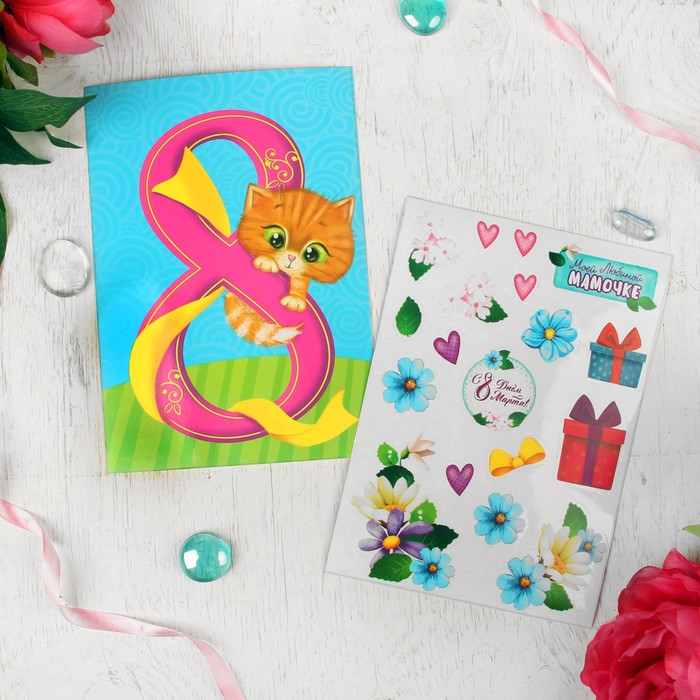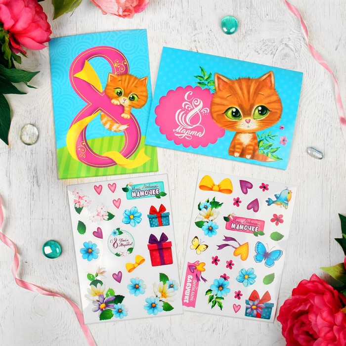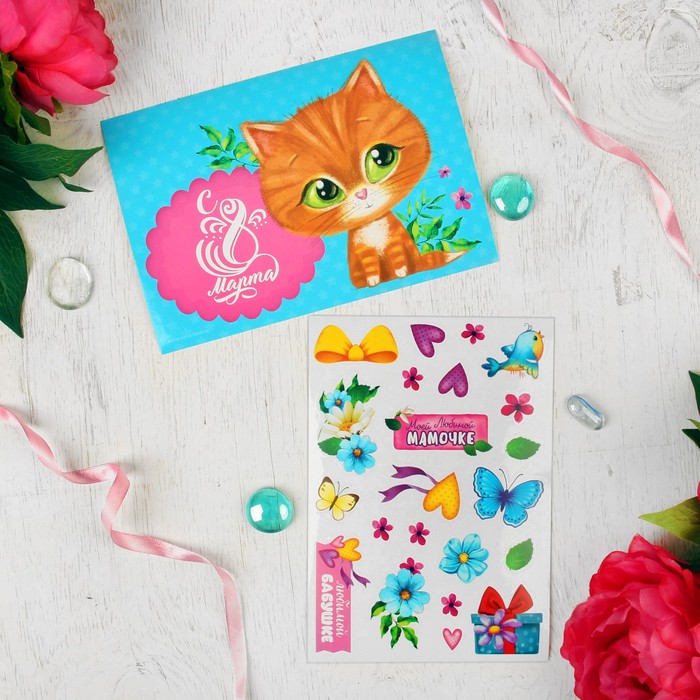 Аппликация многоразовыми наклейками "С 8 Марта", котёнок, набор: 2 листа наклеек, 2 картинки