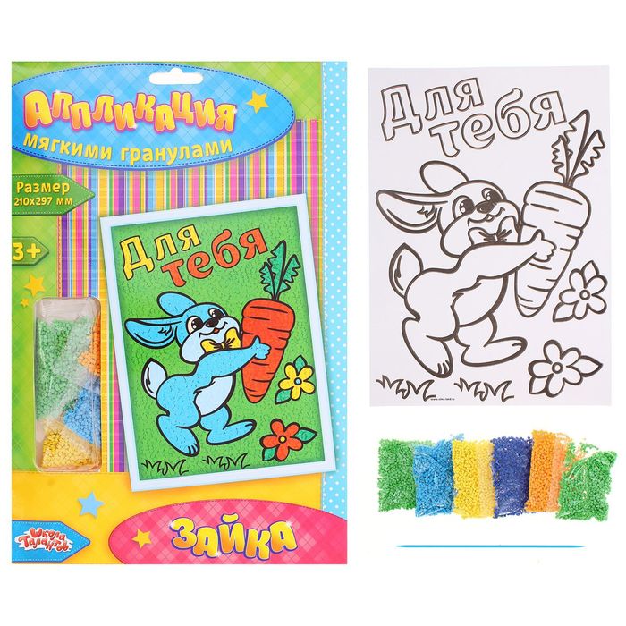 Аппликация мягкими гранулами «Зайка» 21 х 29,7 см — это увлекательный вид творчества, который понравится любому малышу. Клеевая основа защищена специальным слоем бумаги, на который нанесены прорезные контуры. Каждый цвет находится в своей зоне: отделяйте верхний слой с помощью стеки и засыпайте гранулами подходящего оттенка. Специальные контуры не дадут разноцветным частичкам перемешаться и помогут с лёгкостью создать фактурную картину. Засыпайте рисунок постепенно и не забывайте распределять мягкие гранулы по клеевому слою, чтобы добиться особой яркости изображения.