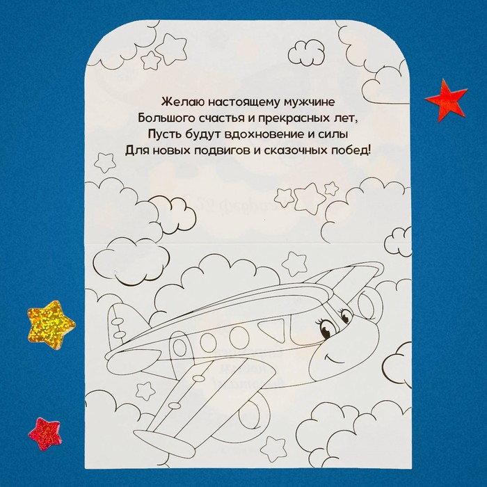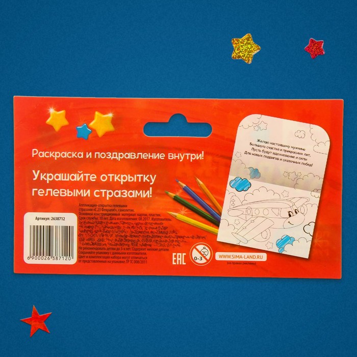 Аппликация на открытке гелевыми стразами "С 23 февраля!", Самолетик