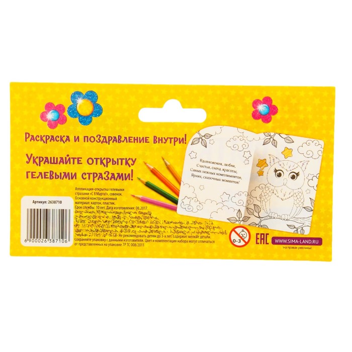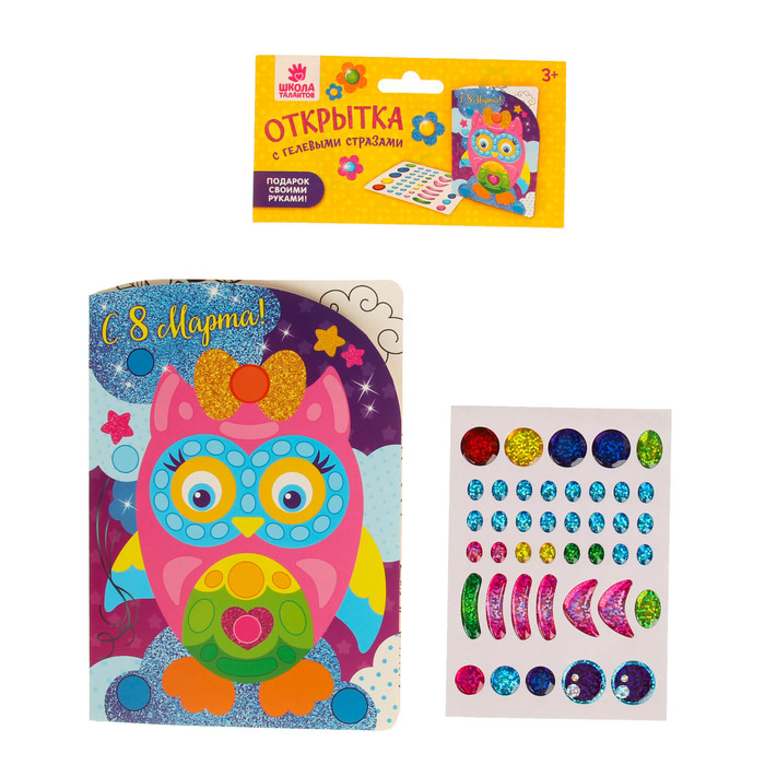 Аппликация на открытке гелевыми стразами "С 8 марта!", Совенок