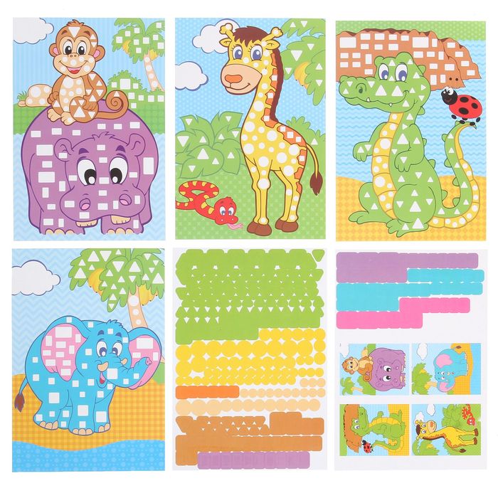 Аппликация наклейками А5 "Африка": 4 картинки + 2 листа наклеек поможет ребёнку ощутить себя настоящим творцом и получить множество ярких эмоций как от процесса декорирования, так и от созерцания законченного шедевра. В наборе малыш найдёт 4 листа-основы с весёлыми животными и 2 листа наклеек для самого увлекательного, полезного и интересного творческого процесса! Благодаря входящим в набор подсказкам малыш всегда сможет посмотреть, как должна выглядеть готовая аппликация, и потому процесс украшения картинки будет не только приятным, но и доступным даже самым маленьким художникам.