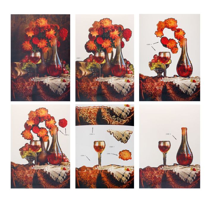 Каждая цифра, проставленная рядом с элементом, соответствует номеру слоя. Каждая прослойка наклеивается в одной плоскости, и картина получается такой объёмной и реалистичной.