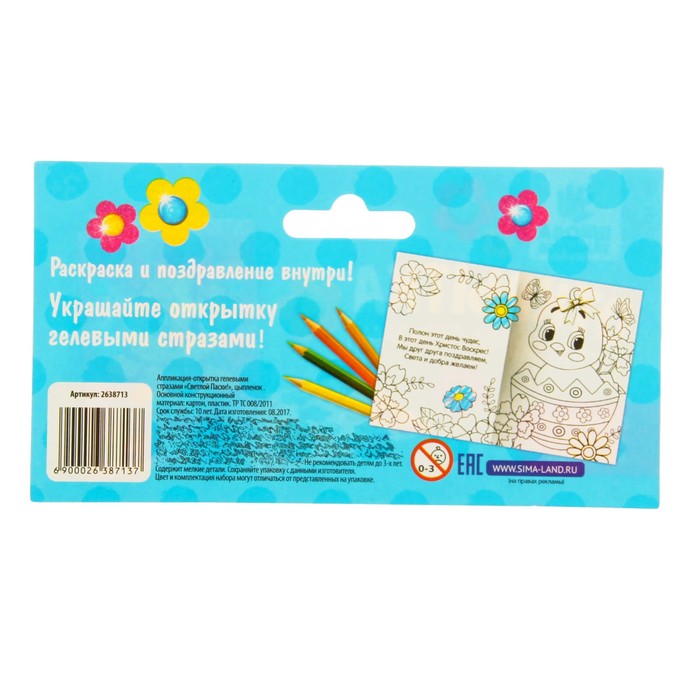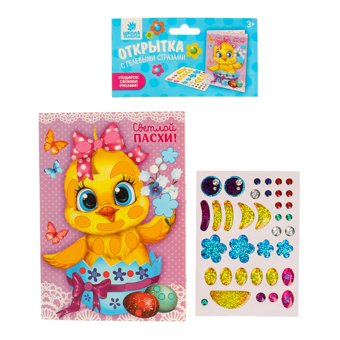 Может быть, именно такой необычный товар, как Аппликация-открытка гелевыми стразами "Светлой Пасхи!" Цыпленок, раскроет неожиданные способности у вашего ребёнка. И даже если он не станет новым Рафаэлем, то ему, определённо, обеспечена богатая фантазия, креативное мышление и золотые руки.
