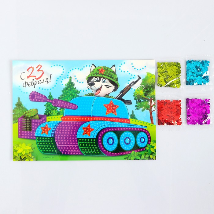 Аппликация пайетками "С 23 февраля" Танк + 4 цвета паейток по 7 грамм