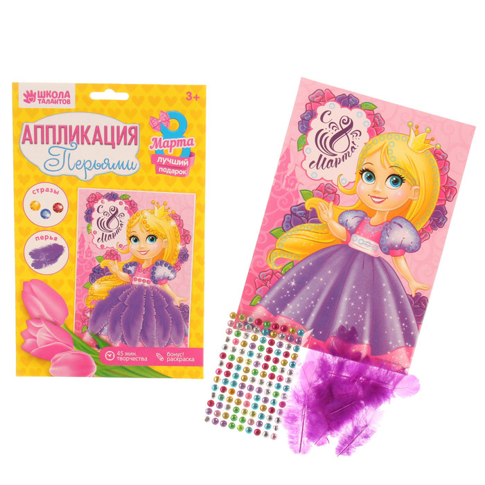 Может быть, именно такой необычный товар, как Аппликация перьями и стразами "С 8 марта!" Принцесса, раскроет неожиданные способности у вашего ребёнка. И даже если он не станет новым Рафаэлем, то ему, определённо, обеспечена богатая фантазия, креативное мышление и золотые руки.