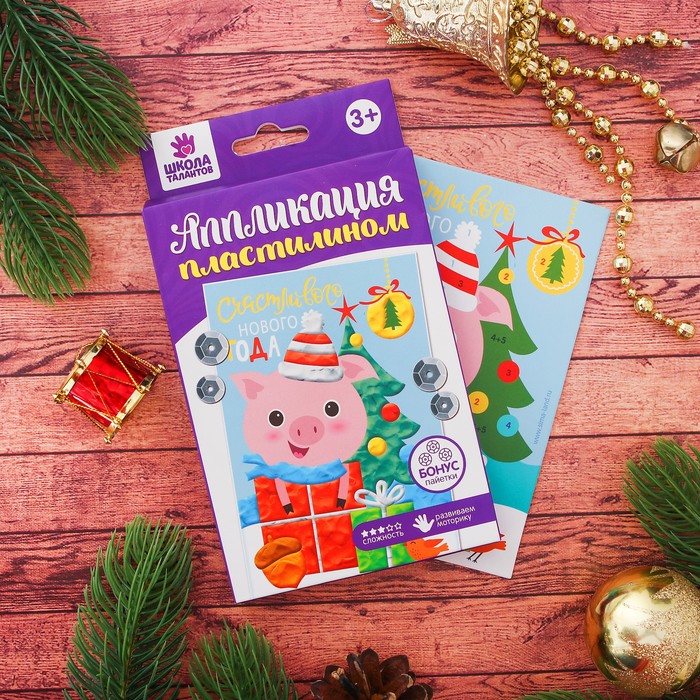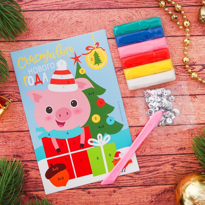 Аппликация пластилином "Счастливого Нового года!" Хрюшка, 6 цветов пластилина по 7 гр
