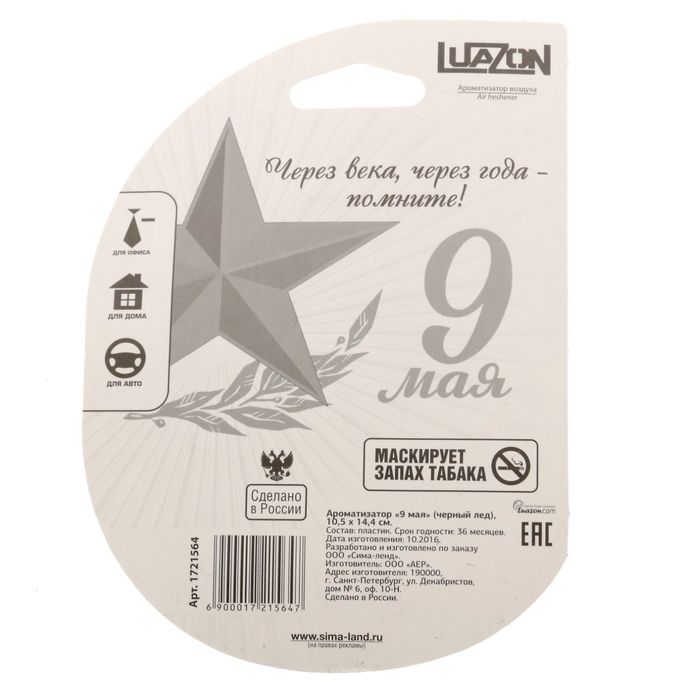 Время идёт, многое в жизни меняется. И только самые важные вещи остаются неизменными. Гордость за свою страну, её победы и величие остаются с нами на протяжении веков. Специально к 9 Мая мы создали серию ароматизаторов для настоящих патриотов. Яркий, современный дизайн не оставит равнодушным владельца автомобиля и его пассажиров. Фигурный аксессуар раскрасит будни и спасёт от неприятных запахов города.