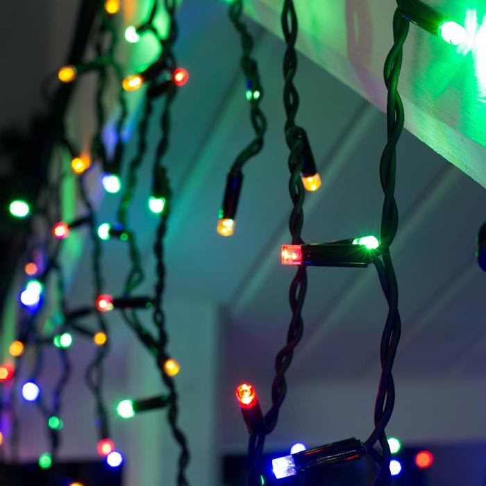 Гирлянда «Бахрома» представляет собой провод, от которого спускаются нити разной длины со светодиодами. Небольшие размеры изделия позволяют украсить им проёмы окон, арки, витрины, края стола. Каучуковый провод отличается прочностью и морозостойкостью. Гирлянда работает от сети.