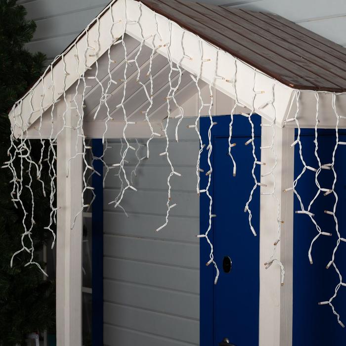 Гирлянда «Бахрома» представляет собой провод, от которого спускаются нити разной длины со светодиодами. Небольшие размеры изделия позволяют украсить им проёмы окон, арки, витрины, края стола. Каучуковый провод отличается прочностью и морозостойкостью. Гирлянда работает от сети.