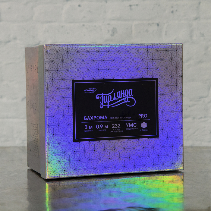 Гирлянда «Бахрома» представляет собой провод, от которого спускаются нити разной длины со светодиодами. Небольшие размеры изделия позволяют украсить им проёмы окон, арки, витрины, края стола. Каучуковый провод отличается прочностью и морозостойкостью. Гирлянда работает от сети.
