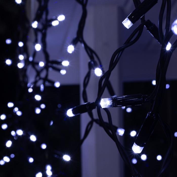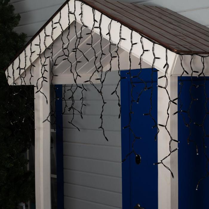 Гирлянда «Бахрома» представляет собой провод, от которого спускаются нити разной длины со светодиодами. Небольшие размеры изделия позволяют украсить им проёмы окон, арки, витрины, края стола. Каучуковый провод отличается прочностью и морозостойкостью. Гирлянда работает от сети.