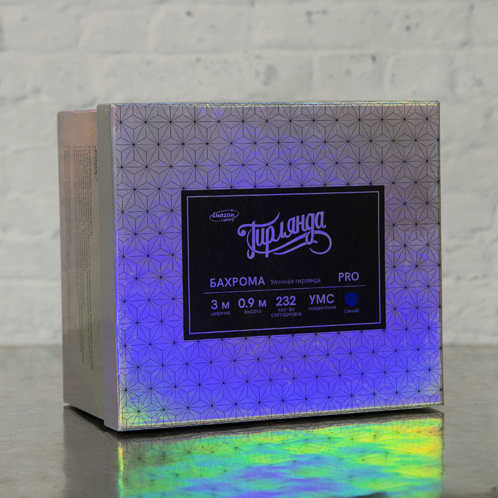 Гирлянда «Бахрома» представляет собой провод, от которого спускаются нити разной длины со светодиодами. Небольшие размеры изделия позволяют украсить им проёмы окон, арки, витрины, края стола. Каучуковый провод отличается прочностью и морозостойкостью. Гирлянда работает от сети.