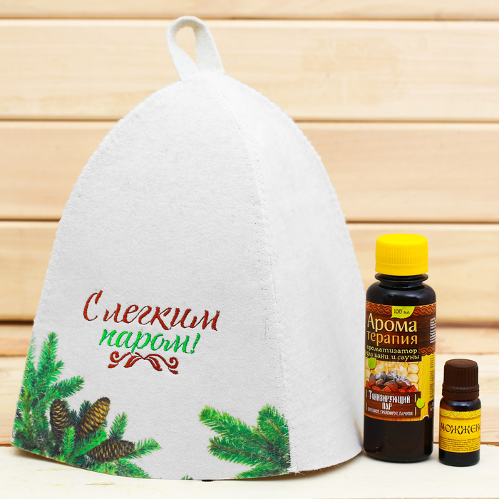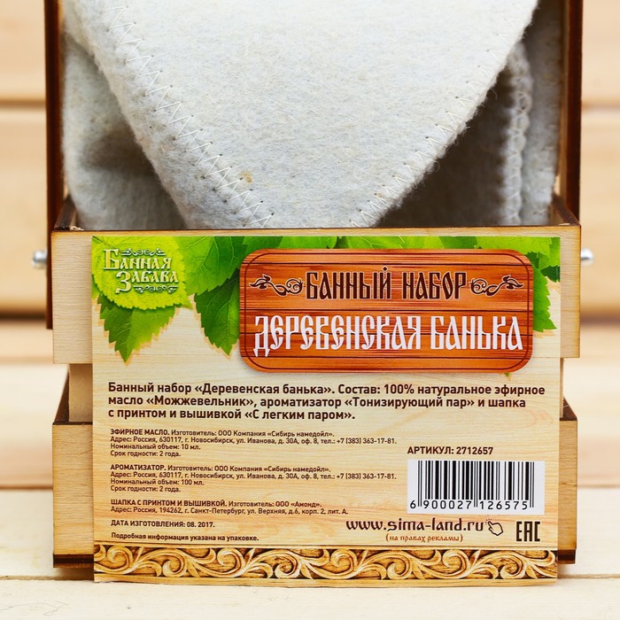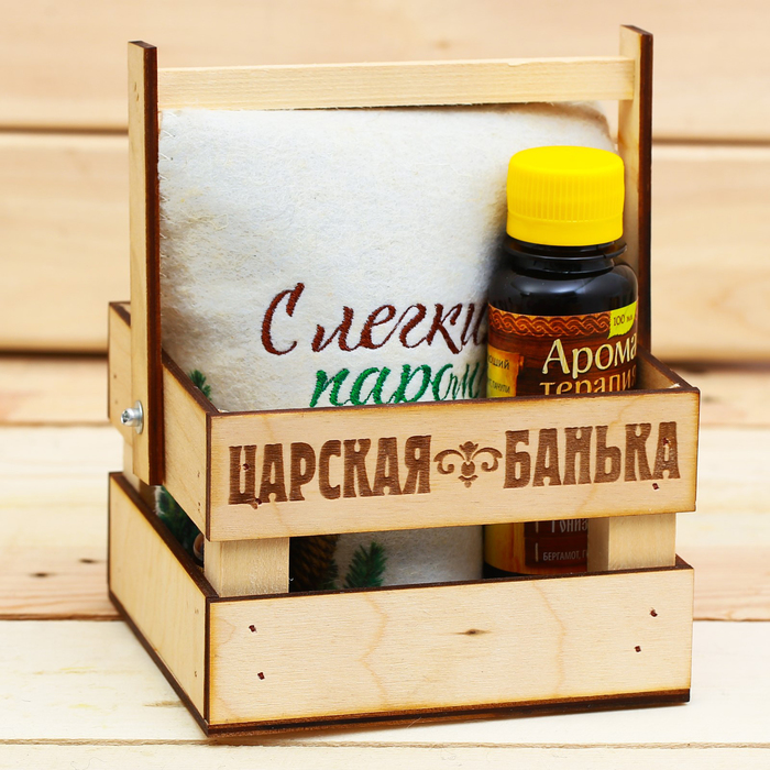 Банный набор в ящике "Деревенская банька": шапка, аромамасло и ароматизатор