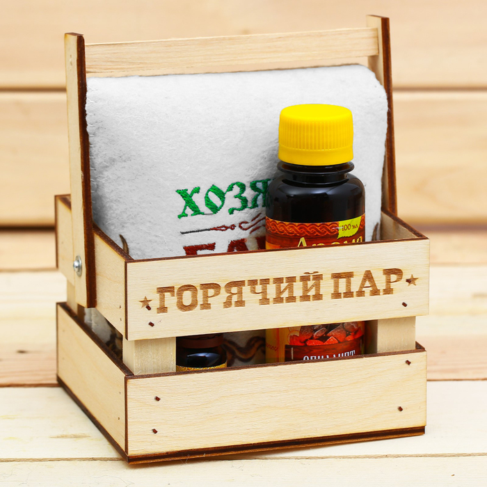 Банный набор в ящике "Горячий пар": шапка, аромамасло и ароматизатор