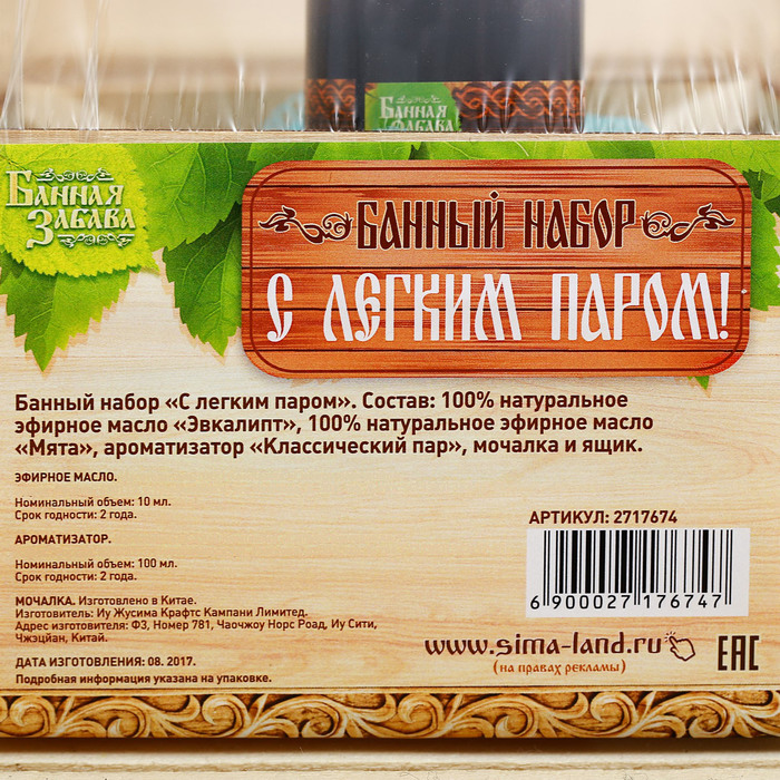 Банный набор в ящике "С лёгким паром": 2 аромамасла, ароматизатор, мочалка