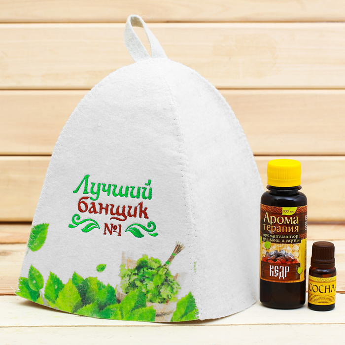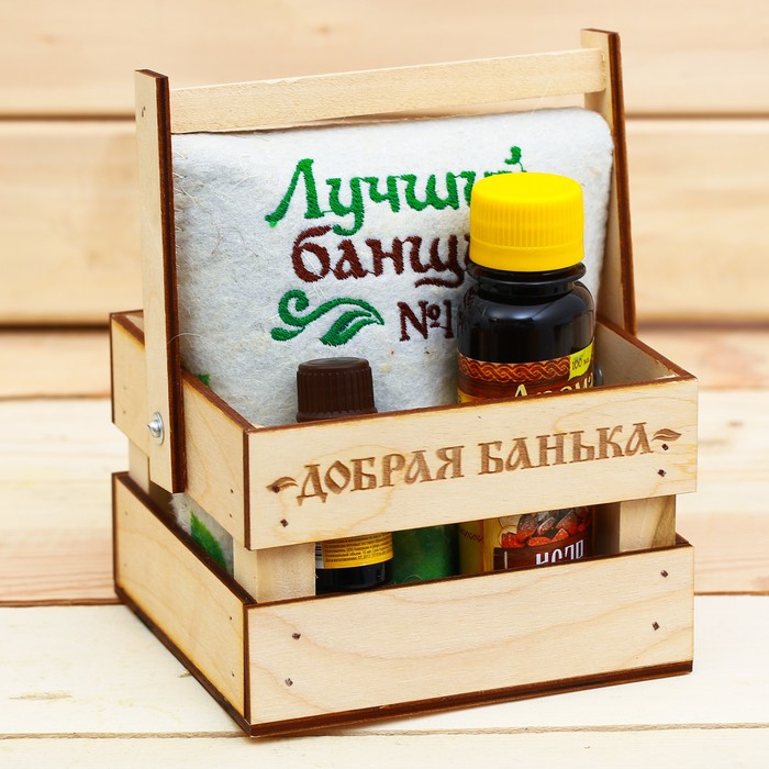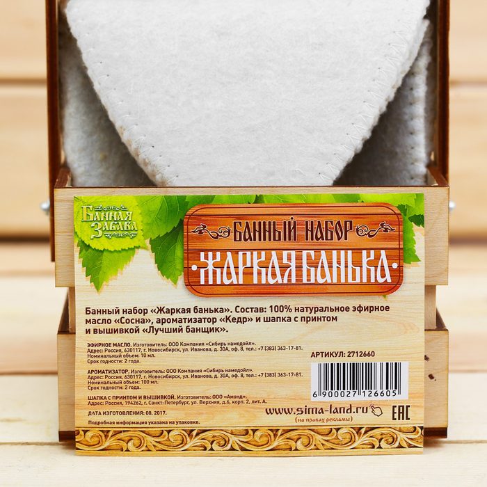 Банный набор в ящике "Жаркая банька": шапка, аромамасло и ароматизатор