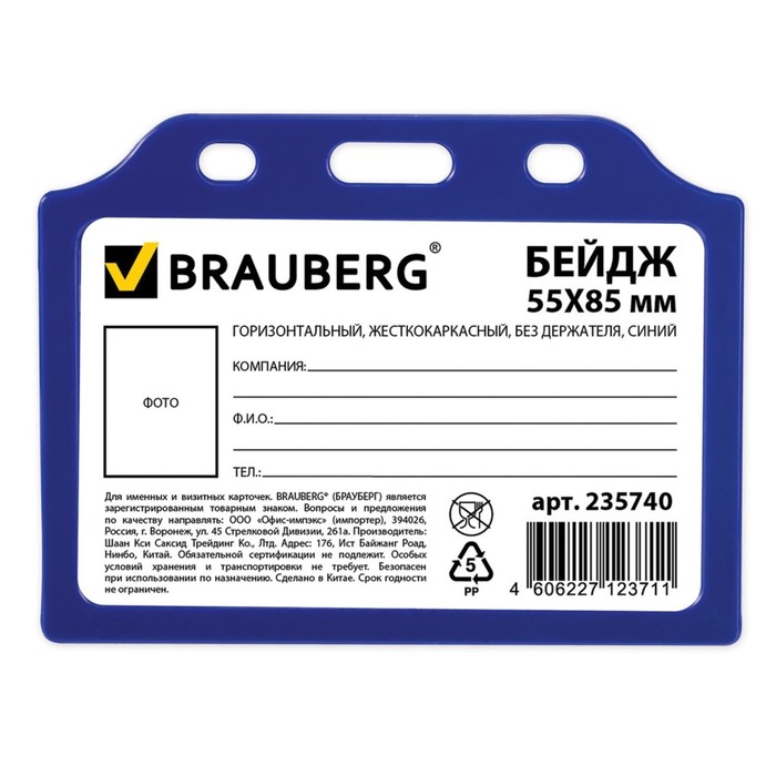 Бейдж горизонтальный 55х85мм, жесткокаркасный, без держателя, синий
