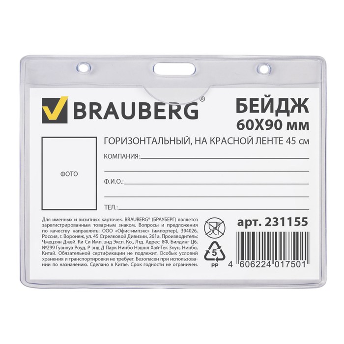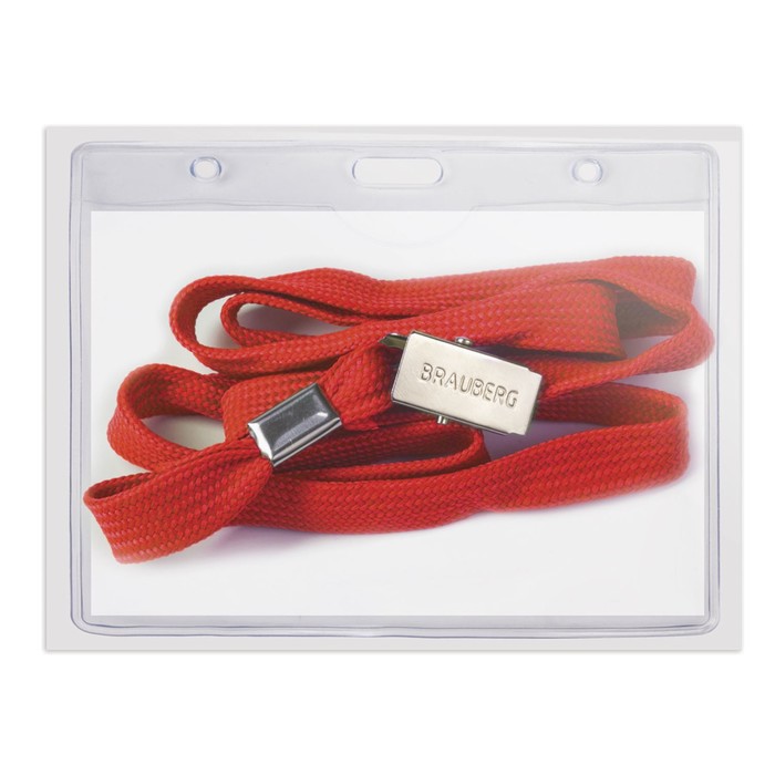 Бейдж горизонтальный 60х90мм, на красной ленте 45см