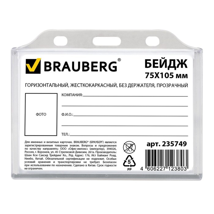 Бейдж горизонтальный 75х105мм, жесткокаркасный, без держателя, прозрачный