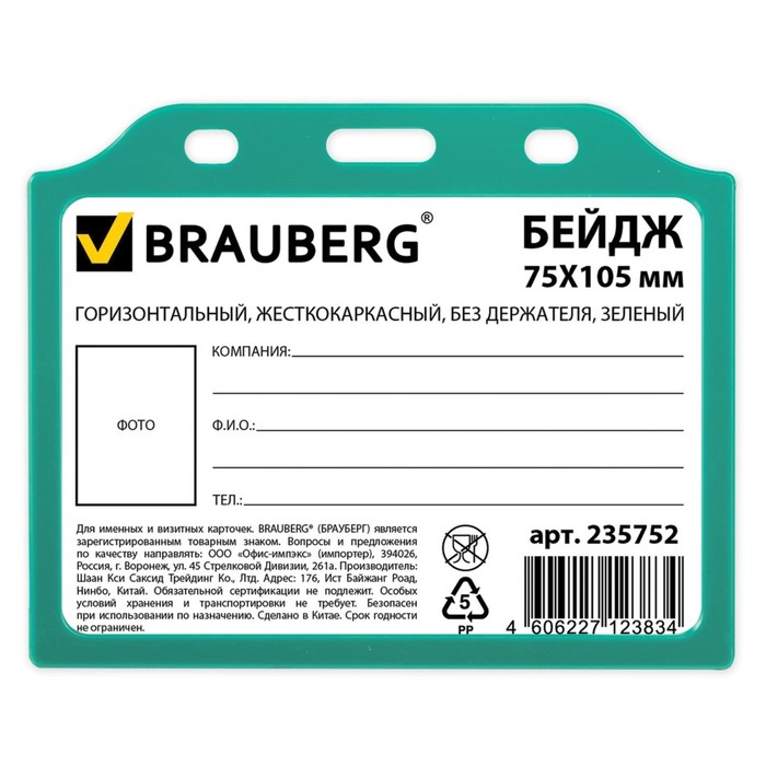 Бейдж горизонтальный 75х105мм, жесткокаркасный, без держателя, зеленый