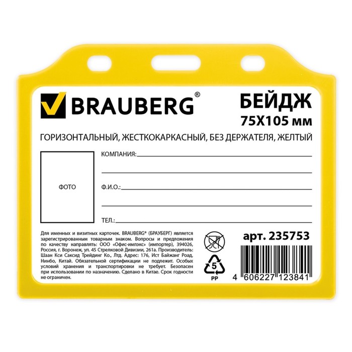 Бейдж горизонтальный 75х105мм, жесткокаркасный, без держателя, желтый
