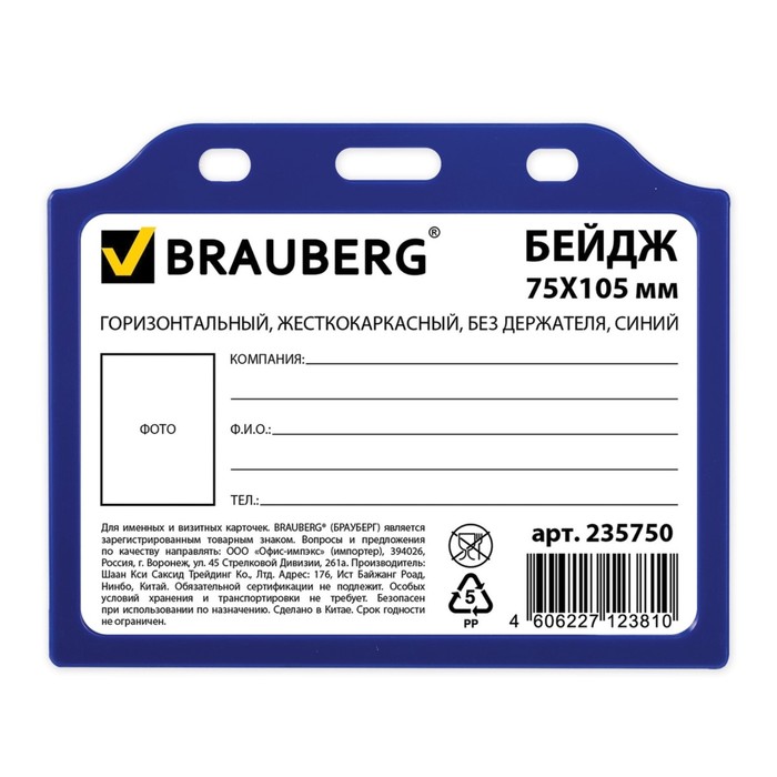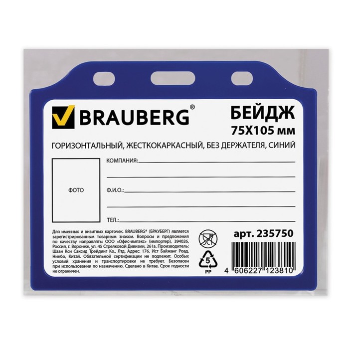 Бейдж горизонтальный жёсткокаркасный, без держателя, синий