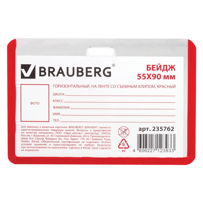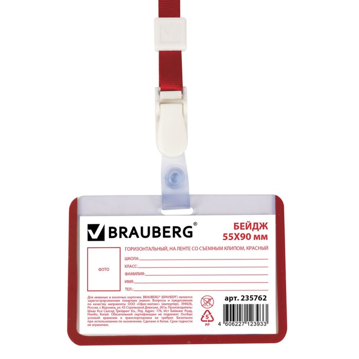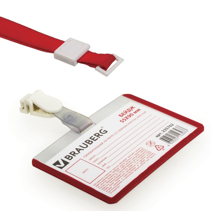 Бейдж школьника горизонтальный 55х90мм, на ленте со съемным клипом, красный