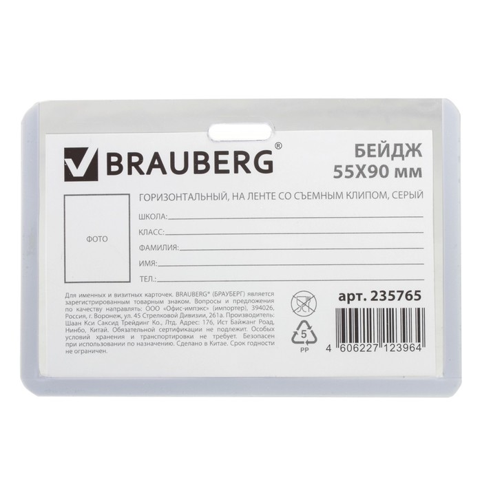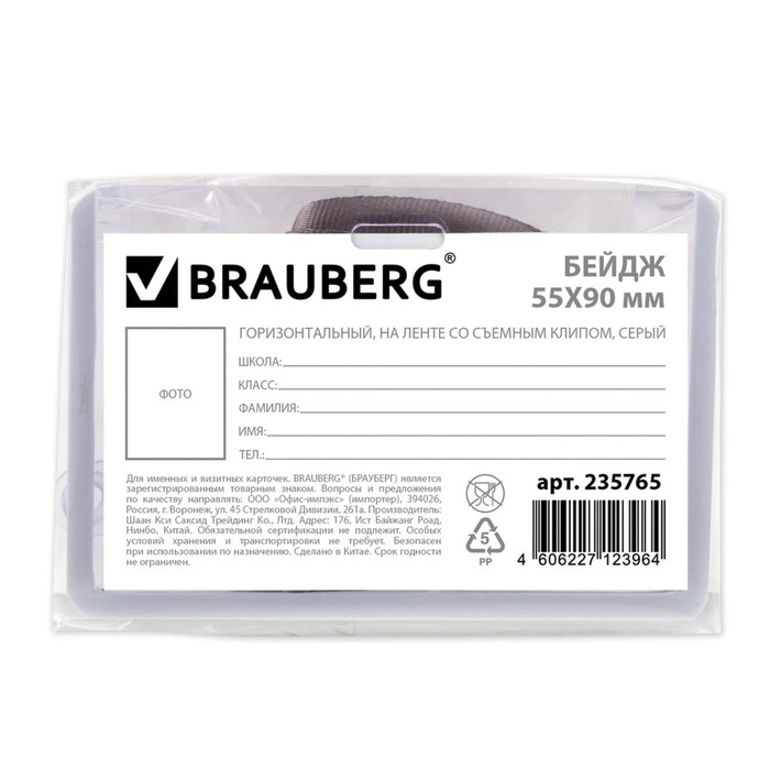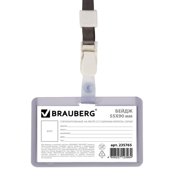 Бейдж школьника горизонтальный 55х90мм, на ленте со съемным клипом, серый