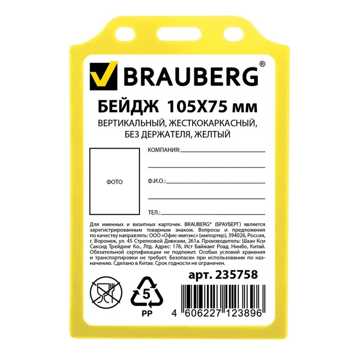 Бейдж вертикальный 105х75мм, жесткокаркасный, без держателя, желтый