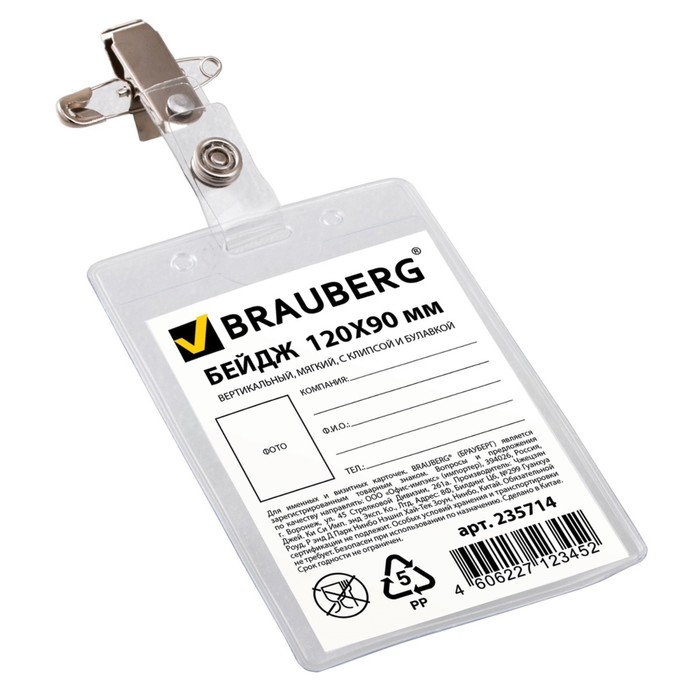 Бейдж вертикальный 120х90мм, мягкий, с клипсой и булавкой