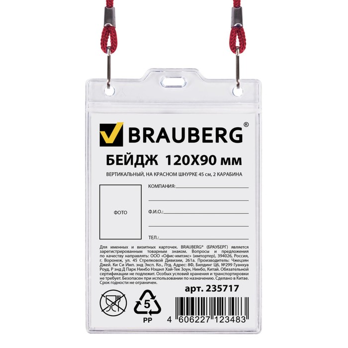 Бейдж вертикальный 120х90мм, на красном шнурке 45см, 2 карабина