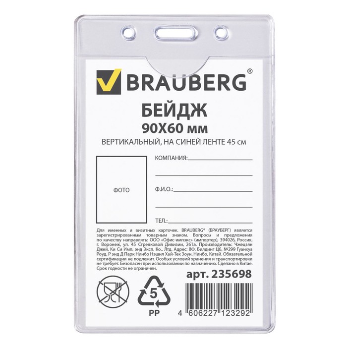 Бейдж вертикальный 90х60мм, на синей ленте 45см