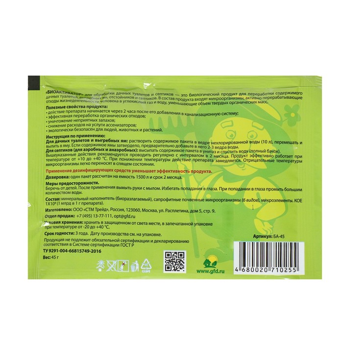 Биоактиватор для дачных туалетов Счастливый дачник, 45 г быстро и эффективно справляется со своей задачей. Его легко использовать, препарат хорошо устраняет запах, уничтожает бумагу, органику и жиры. Кроме того, он разлагает даже сложные отходы, которые могут не поддаваться обычным биологическим процессам.