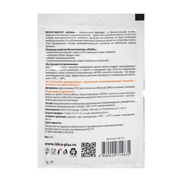Биоактиватор для септиков, выгребных ям и дачных туалетов Искра, 70 г быстро и эффективно справляется со своей задачей. Его легко использовать, препарат хорошо устраняет запах, уничтожает бумагу, органику и жиры. Кроме того, он разлагает даже сложные отходы, которые могут не поддаваться обычным биологическим процессам.