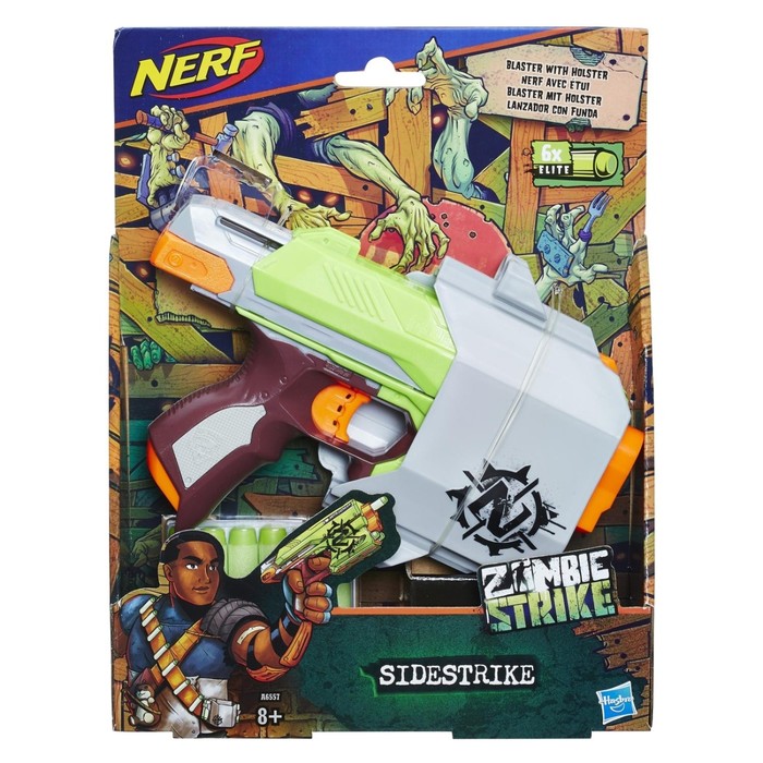 Бластер «Сайдстрайк» — компактное оружие для охоты на зомби. Его пусковой механизм способен отправлять снаряды на расстояние до 22 метров. Благодаря удобной кобуре пистолет и дополнительные патроны можно носить на ремне. Вставьте в ствол патрон и нажмите на курок, чтобы отправить пулю прямо в ходячего мертвеца. Не нужно бояться ранений при случайном попадании в свой отряд — патроны совсем не опасны для людей.