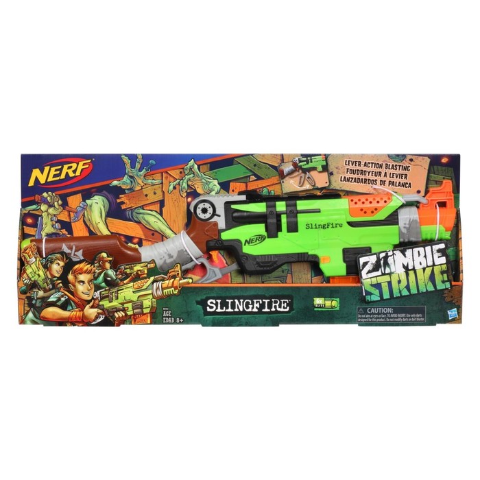 Бластер «Слингфайр» — идеальное оружие для охоты на зомби. Его пусковой механизм способен отправлять снаряды на расстояние до 22 метров. Вместительная обойма этого стильного образца вмещает сразу 6 поролоновых пуль. Не нужно бояться ранений при случайном попадании в свой отряд — патроны совсем не опасны для людей и не причинят вреда.