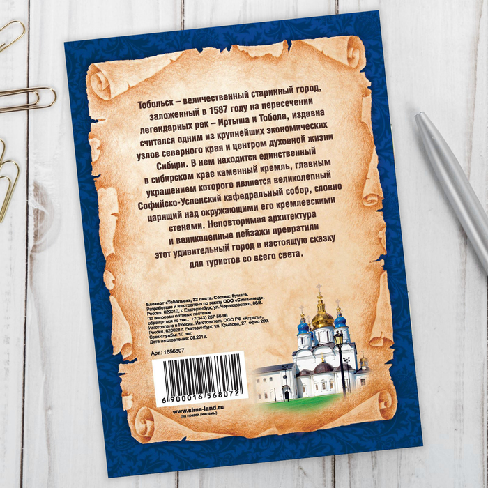 На блокноте изображён Тобольск — величественный старинный город, заложенный в 1587 году, издавна считался одним из крупнейших экономических узлов северного края и центром духовной жизни Сибири. В нём находится единственный в сибирском крае каменный Кремль, главным украшением которого является Софийско-Успенский кафедральный собор. Он был построен в 1683‒1686 гг. московскими и устюжскими каменщиками и стал первым каменным церковным зданием Сибири. Несмотря на свой возраст, собор выглядит молодо и нарядно.