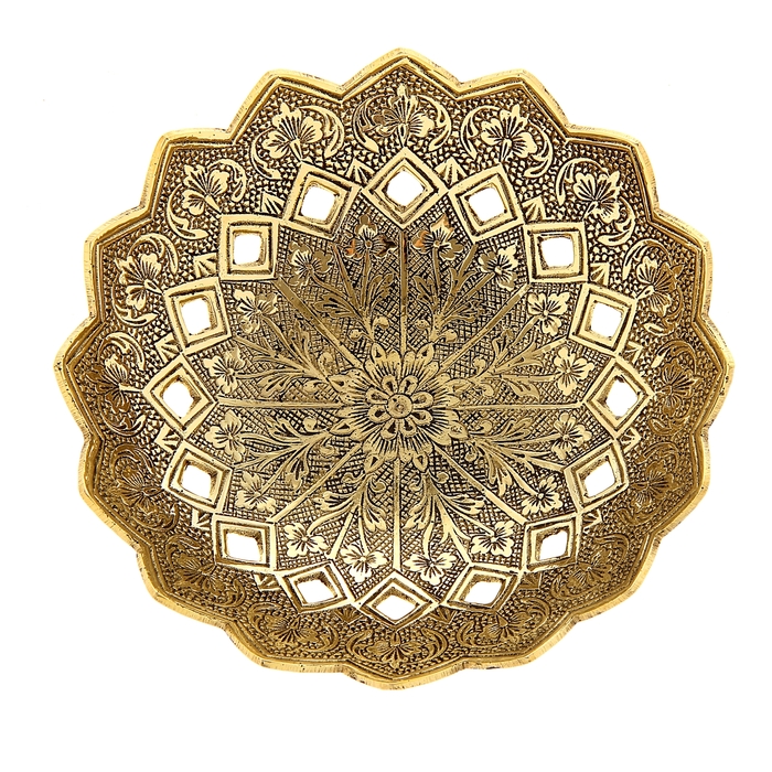 Изысканное блюдо "Цветочный куст", словно обрамлено геометрическим кружевом, выполнено из высококачественной латуни индийскими мастерами по традиционным технологиям производства. Блюдо, которое отлично подойдет для сервировки стола вкусными десертами или свежими фруктами. На него хочется смотреть с восхищением!