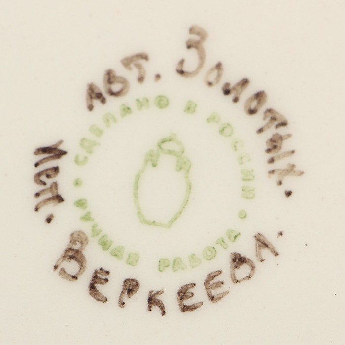 Особенность росписи в индивидуальном почерке, мотивом которого является букетно-растительный орнамент на белоснежном фоне фаянса. Особую утончённость и изысканность придают изделиям пейзажные рисунки.